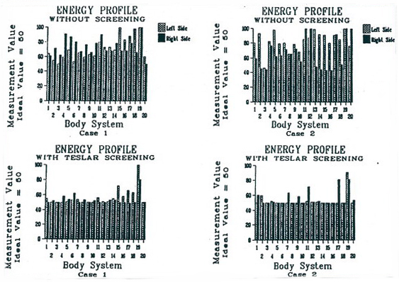 Graph 1 shows the measurement values obtained when she was exposed to the fields given off be a V. D. T. (video/computer terminal). Measurements were taken on the INTERRO computerized measuring instrument. The TESLAR watch was then strapped to the left wrist of Mrs. X and the same points were immediately re-measured. The results are shown in Graph 2. Dramatic improvement is seen in most organs although there remains some stress on the left kidney. The patient had no specific complaint suggesting kidney involvement except for some mild back-ache, which she had thought was due to muscular strain.